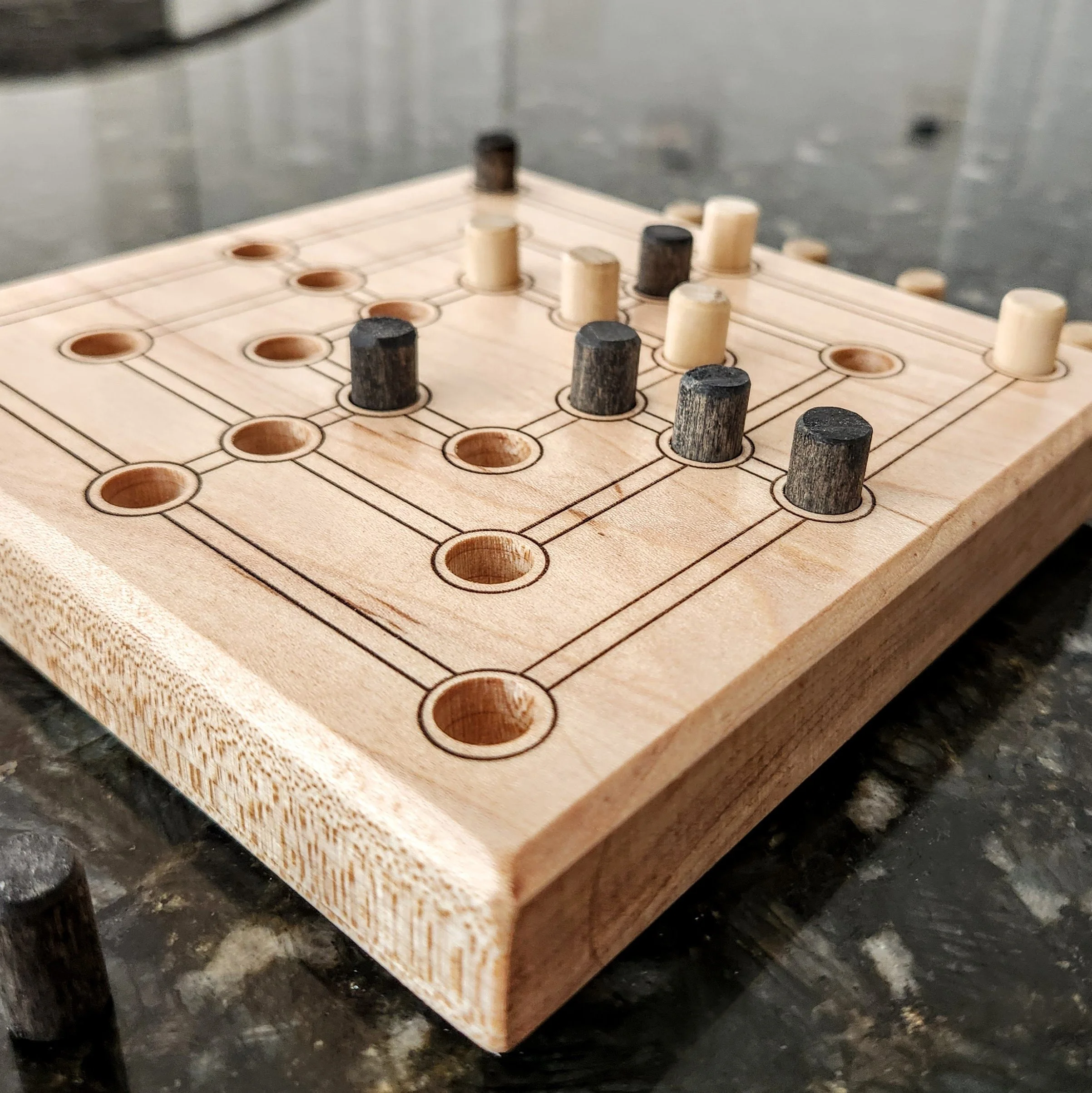 Phase 2: Once all pieces have been played, turns continue to alternate, but now instead of placing a piece, the player must move one of their pieces to an adjacent spot along the lines on the board. At any point, if a mill is created, immediately remove an opponent’s piece from the board that isn’t part of a mill.