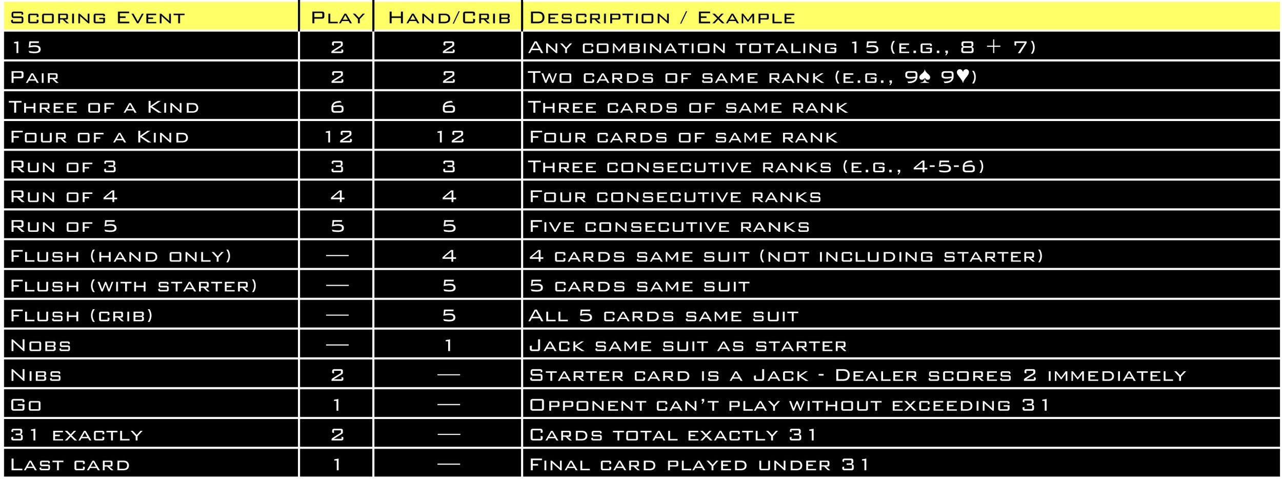 Cribbage has quite a few rules and there is no need to rewrite something that has already been well written. Please see links below for both a written and video set of rules as well as a scoring matrix.