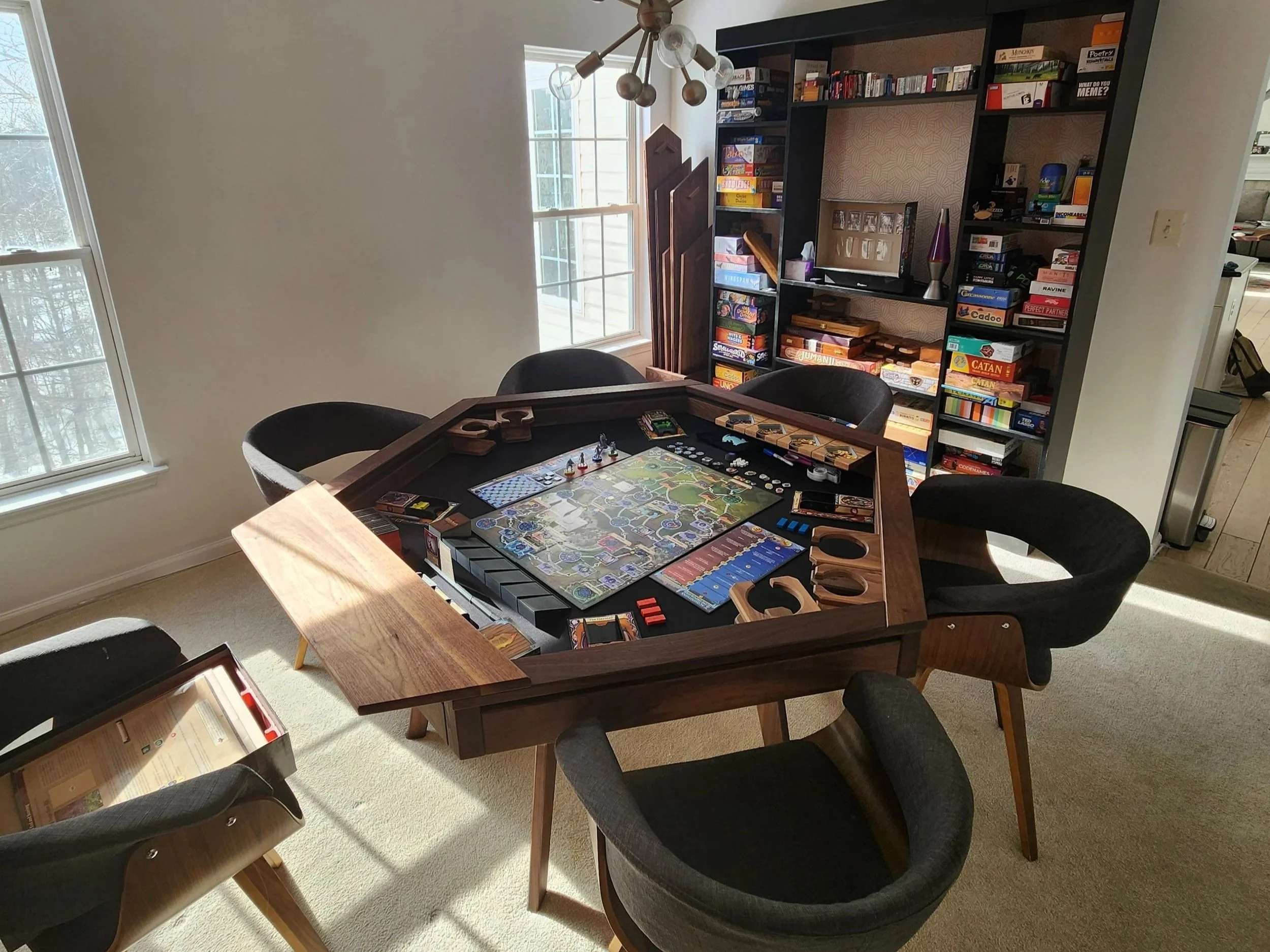 A gaming table is a beautiful dining table (or coffee table!) with a hidden secret! Underneath the removable top is a recessed gaming area for you to play and store your board games or puzzles. That way, if you don’t finish your game in time for dinner, you can simply put the top back on to eat, and your game remains completely intact underneath ready for you the next you are available to play.