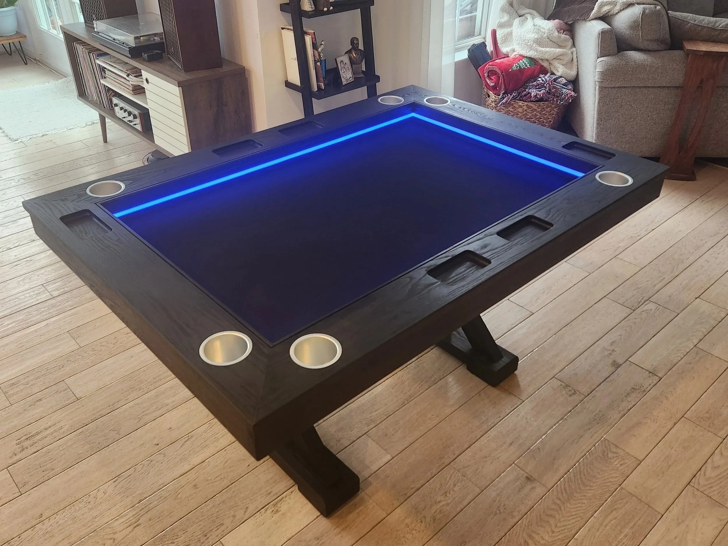 Designing your table is easier than it sounds! Start by choosing a style the fits your space from wood species to leg design. Then choose your accessories like cup holders, game piece trays, LED lighting or anything else you can think of that matches your gaming style. Dimensions will be tailored to your room ensuring a perfect fit in your home.